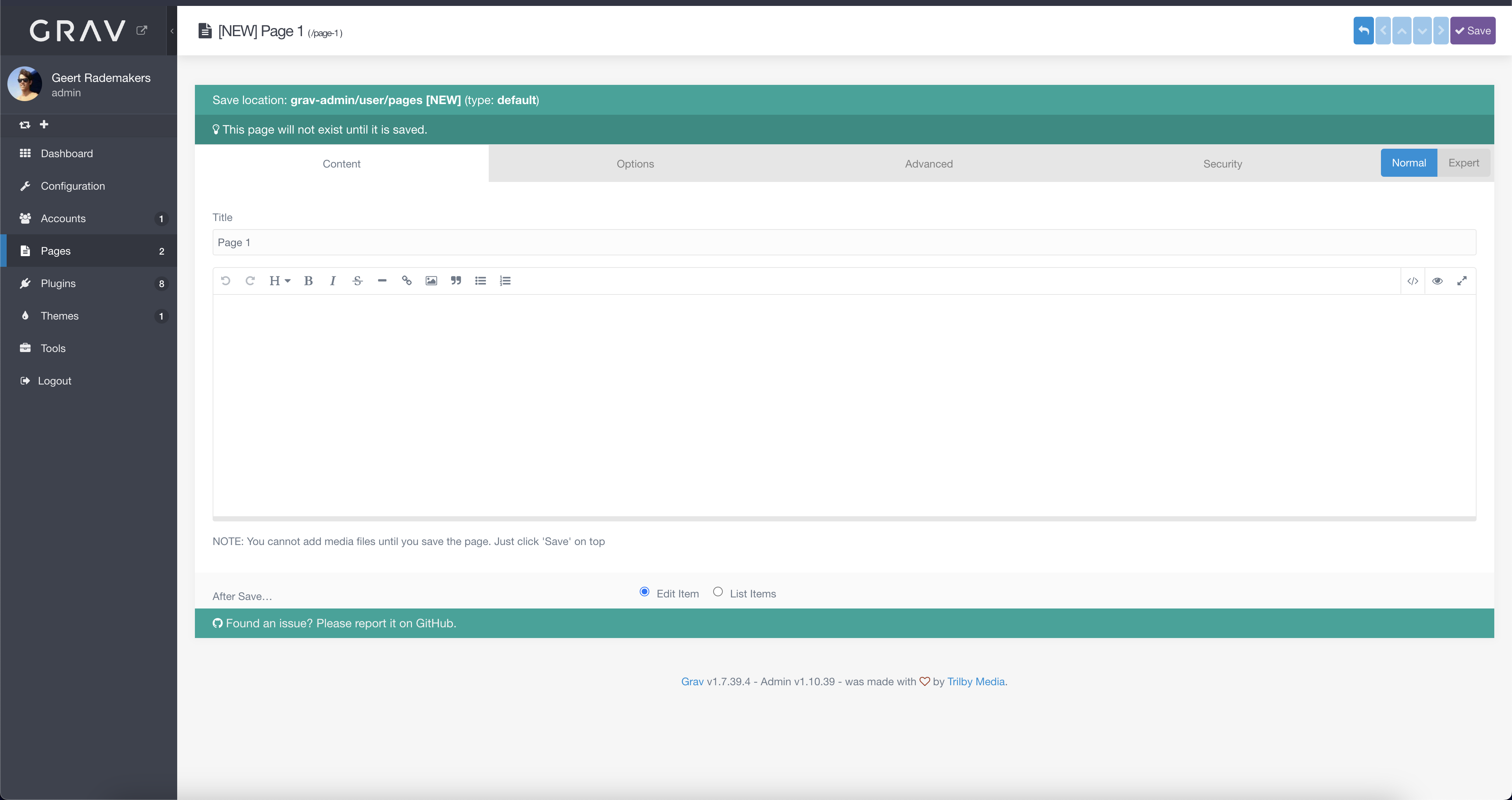 After clicking 'continue' on the popup modal in figure 2, you'll land on the new and to be edited page displayed in figure 3. As displayed in the above, This page will not exist until it is saved. This is important, because most of the editors, aswell as the media, are only available after the page has been saved. It is recommended to save the page now, before continuing. You can save the page, by pressing the 'Save' button, in the upper right position on the screen.