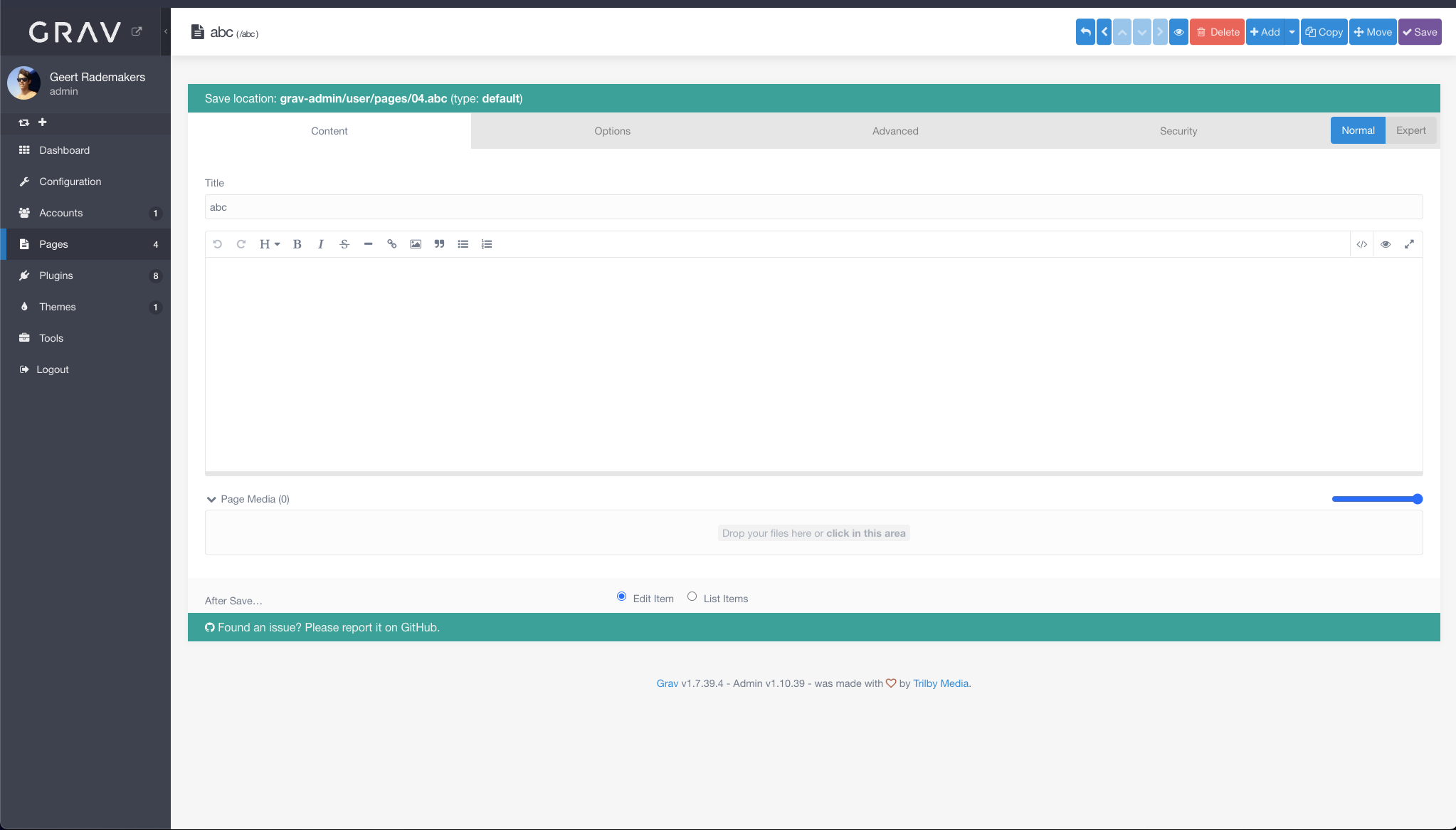 After saving the page, you will see the correct editor and the media part. You can now add content to the page and check how the page looks like by either visiting the url (if the page is visible), or by pressing the 'eye' icon next to the 'delete' button (figure 4). This will preview the page, so you can see the page, before publishing it.