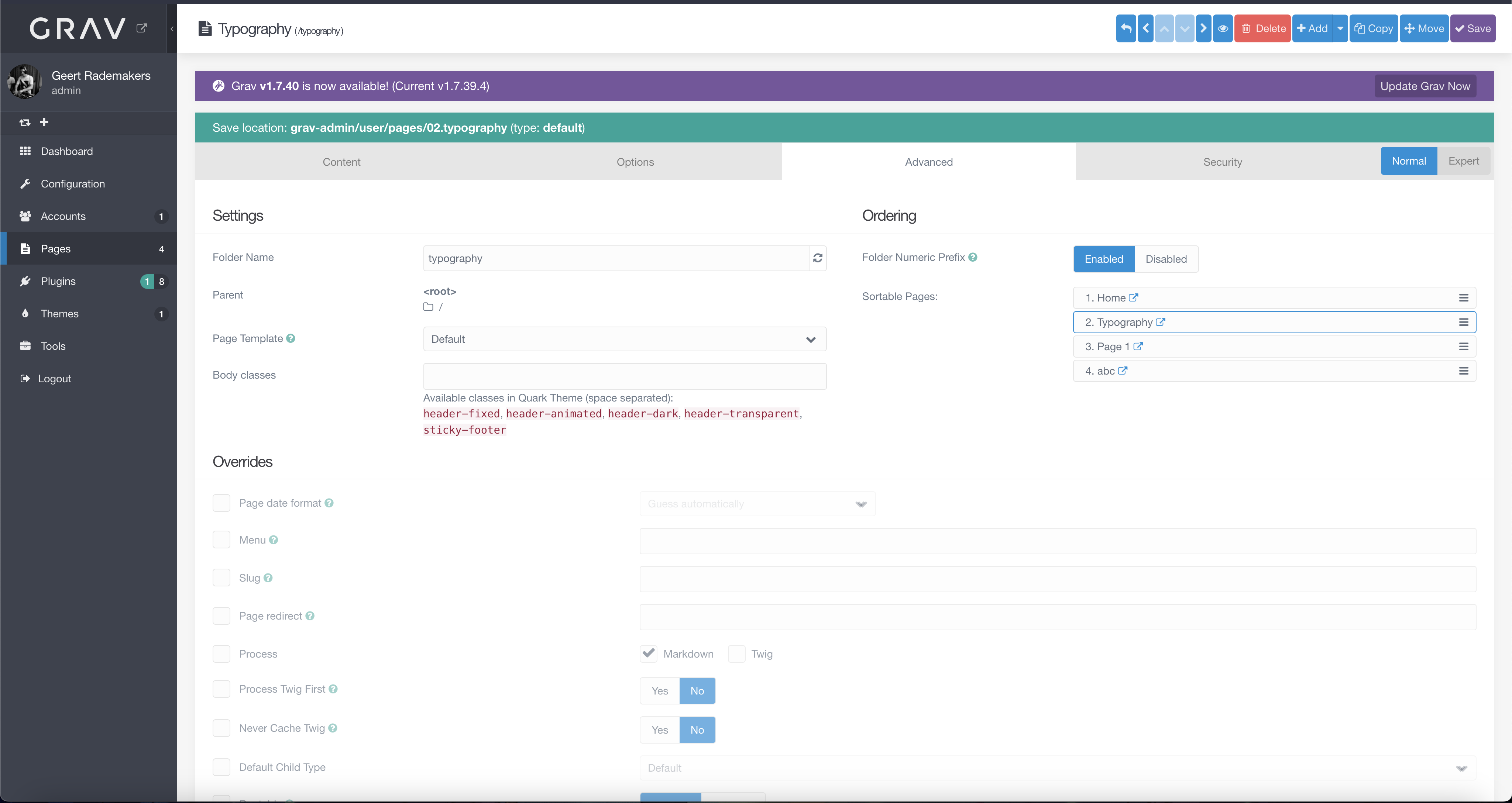 To change the order of the page, click on the 'advanced' tab (figure 2). Here you will find the following page (figure 3). You can change the order by enabling 'Folder Numeric Prefix' and saving the page. This will add a number to the folder, after which you can change it in order. Be sure the other pages in this folder also have 'Folder Numeric Prefix' enabled, else you won't be able to change the order.