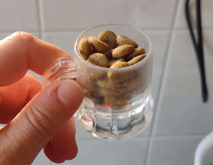 - Ze moet 1 heel shotglaasje (vol zonder kop) brokken per vakje hebben, zie foto. Brokken zitten in de zwartwitte bak.
